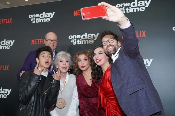 (L-R) Marcel Ruiz, Stephen Tobolowky, Rita Moreno, Justina Machado, Isabella Gomez ir Toddas Grinnellas pasiima asmenukę „Netflix“ „Vienos dienos metu“ 3 sezono premjeroje „Regal Cinemas L. A. Live Stadium“ 2019 m. Vasario 07 d. Los Andžele, Kalifornijoje. (Rachel Luna/„Getty Images“ nuotrauka)